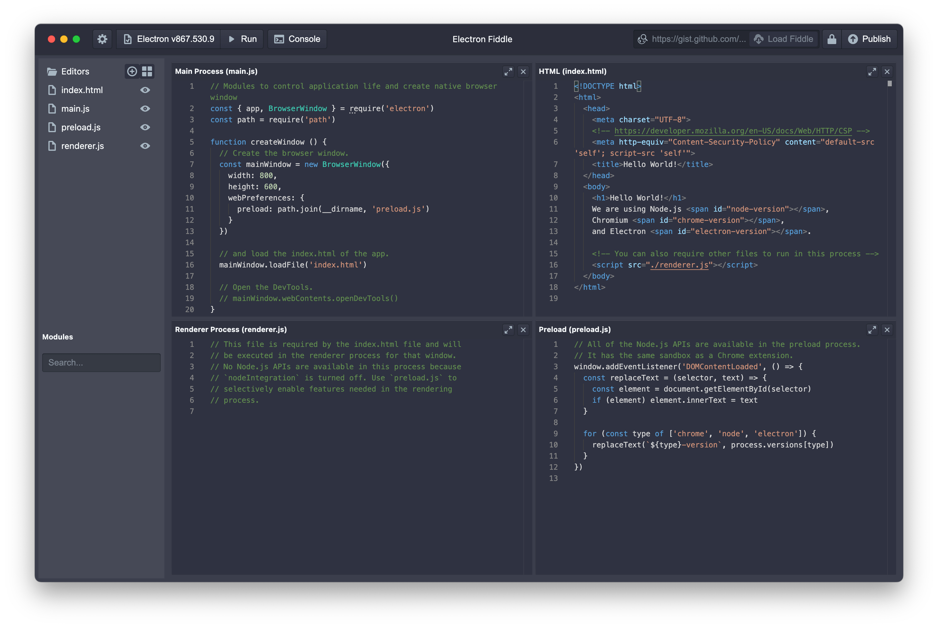 Electron Fiddle lets you create and play with small Electron experiments. It greets you with a runnable quick start template — change a few things, choose the version of Electron you want to run it with, and play around. Then, save your fiddle locally or as a GitHub Gist. Once uploaded to GitHub, anyone can try your fiddle out by just entering the Gist URL in the address bar.