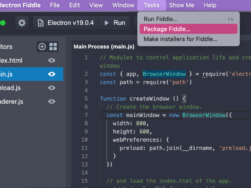 Fiddle can automatically turn your experiment into binaries you can share with your friends, coworkers, or grandparents. It does so thanks to Electron Forge, allowing you to package your fiddle as an app for Windows, macOS, or Linux.