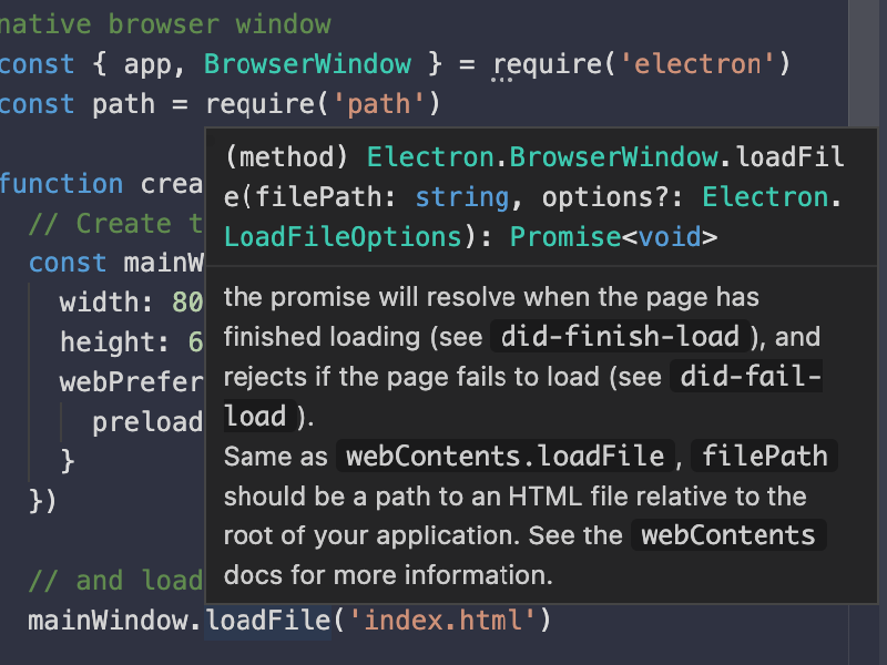 Fiddle is built on Microsoft's excellent Monaco Editor, the same editor powering VS Code. It also installs the type definitions for the currently selected version of Electron automatically, ensuring that you always have all Electron APIs only a few keystrokes away.